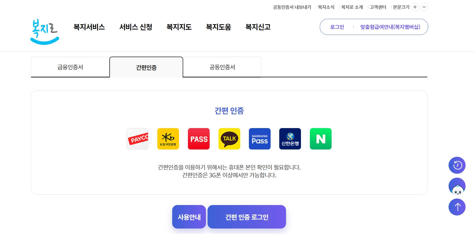 1. 복지로 사이트에서 먼저 우측 상단에 로그인 버튼을 클릭하여 로그인합니다. 금융인증서, 공동인증서 외 간편인증도 있으니 편한 방법으로 로그인해주세요.