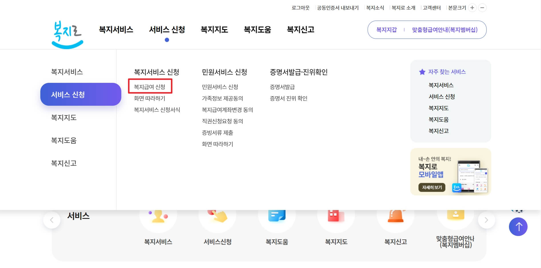 2. 상단의 [서비스 신청] 에서 [복지급여 신청] 메뉴를 클릭합니다.