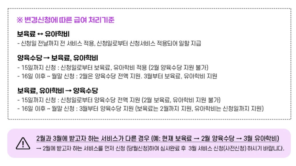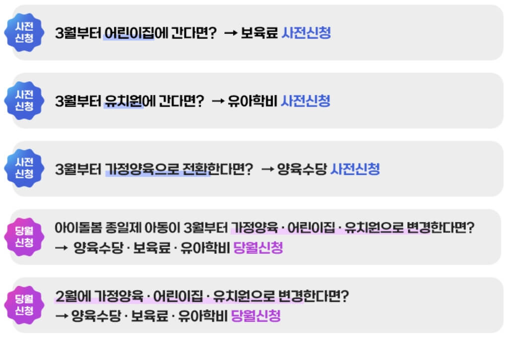 기존에 2월까지 어린이집을 다니다가 새로 유치원 혹은 영어유치원에 입학하거나, 혹은 가정보육을 하다가 유치원에 입학하는 경우 등 우리 아이가 다니는 곳이 변경되면 반드시 직접 신청을 해주어야 합니다.
