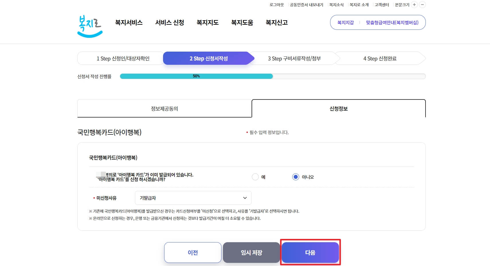 6. 다음으로 아이행복카드 혹은 국민행복카드 신청 여부에 대해 확인합니다. 기존에 어린이집을 보내셨다면 아이행복카드나 국민행복카드가 이미 있으실테니 아니오를 선택하고 다음을 클릭해줍니다.