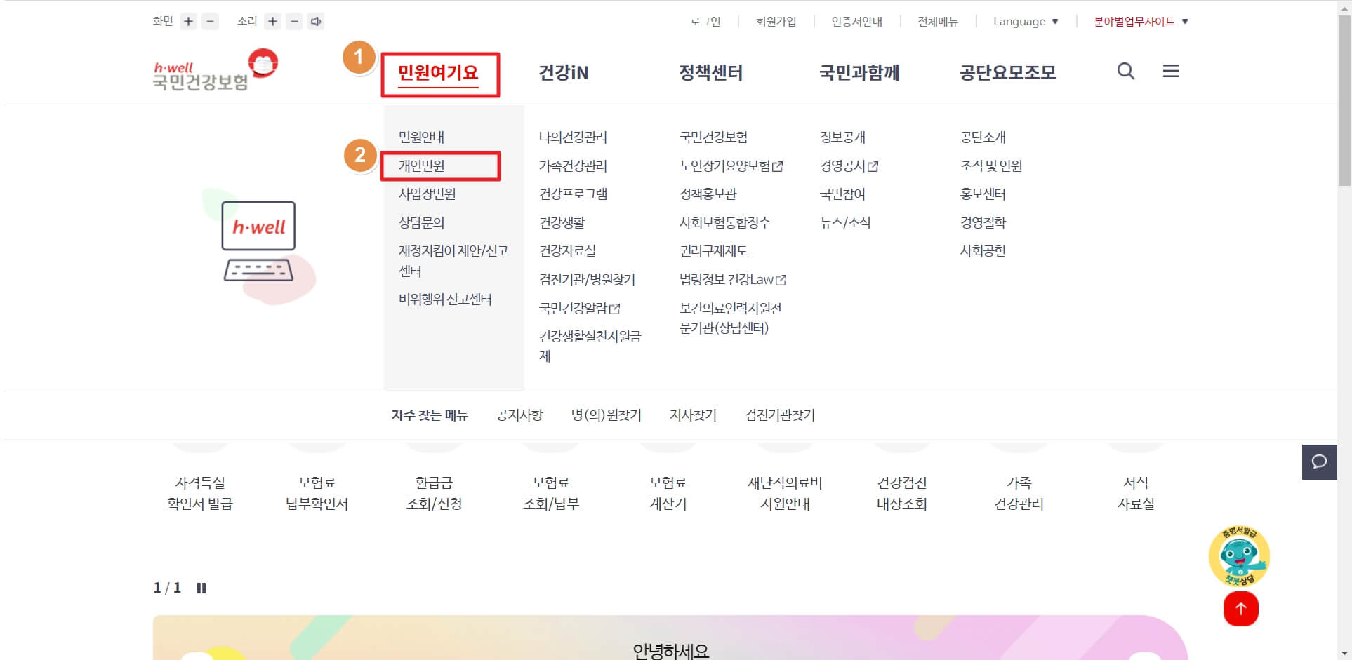 1. 공단 홈페이지 접속 후 상단의 [민원 여기요] 메뉴에서 [개인민원]을 클릭하여 줍니다.
