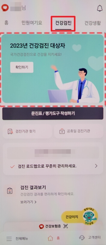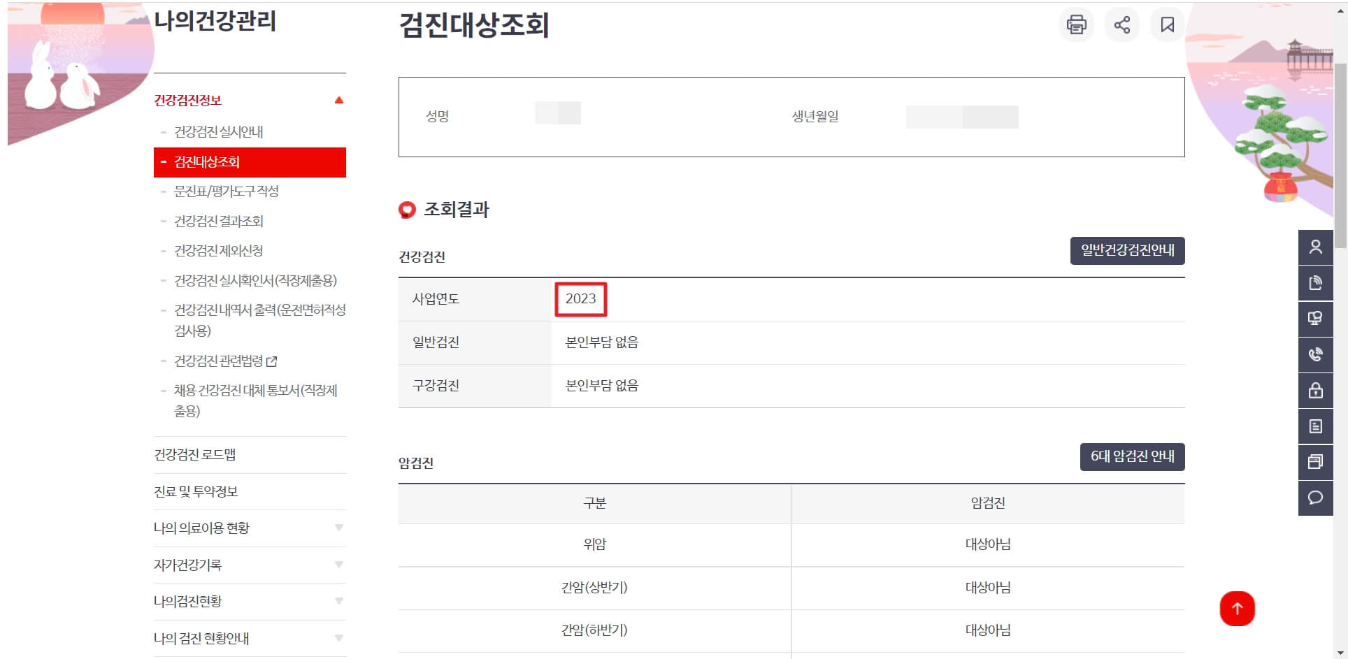 4. 로그인 전 메뉴에 접속하였기 때문에 로그인을 하시면 바로 올해 검진대상자 인지 확인할수 있습니다. 사진과 같이 2023년도 대상자라면, '2023'이라고 표시가 됩니다.