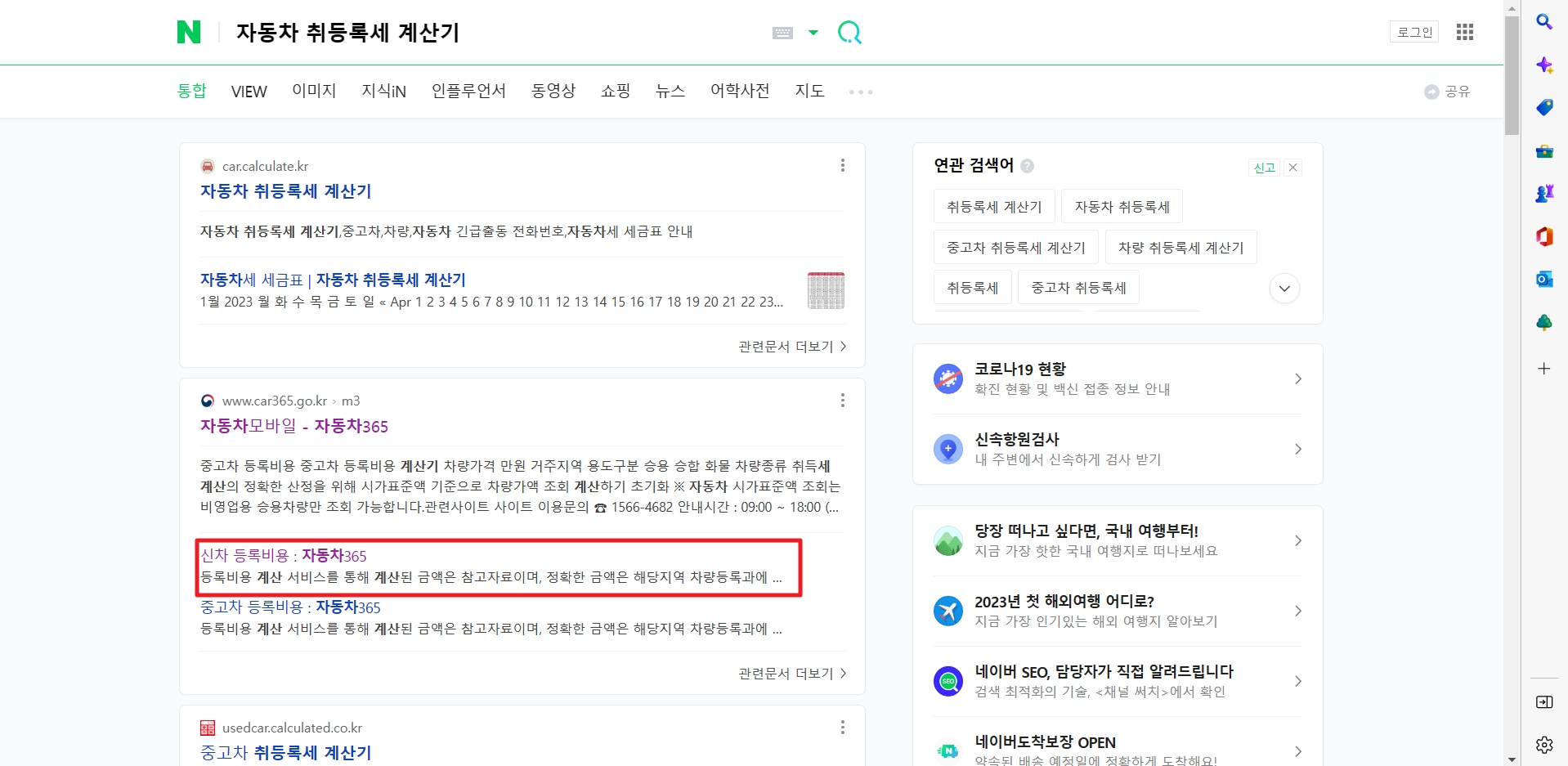 단, 네이버를 통해 접속할 시 사진과 같이 '신차 등록비용 : 자동차 365' 페이지를 클릭하여 접속하시기 바랍니다.