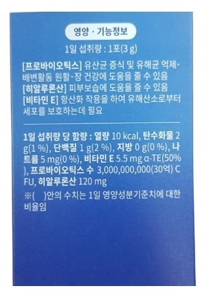 닥터아돌 히알바이오틱스의 영양기능정보를 보면 아래와 같이 크게 3가지 성분이 배합된 것을 알 수 있습니다.